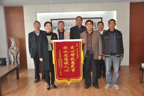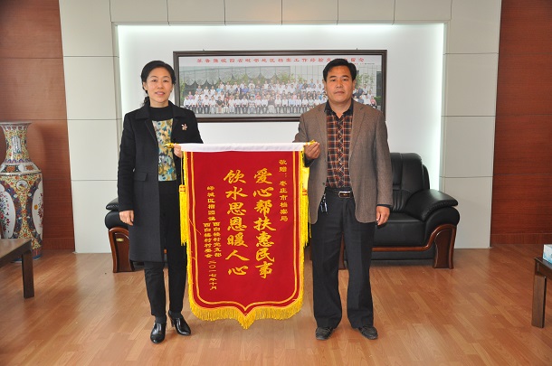 11月16日,市档案局帮扶的西白楼村支部代书记姚洪岗、村主任王化跃代表西白楼村全体村民专程到市档案局,送来了一面写有“爱心帮扶惠民事,饮水思恩暖人心”的锦旗,以表达对扶贫工作的感激之情。