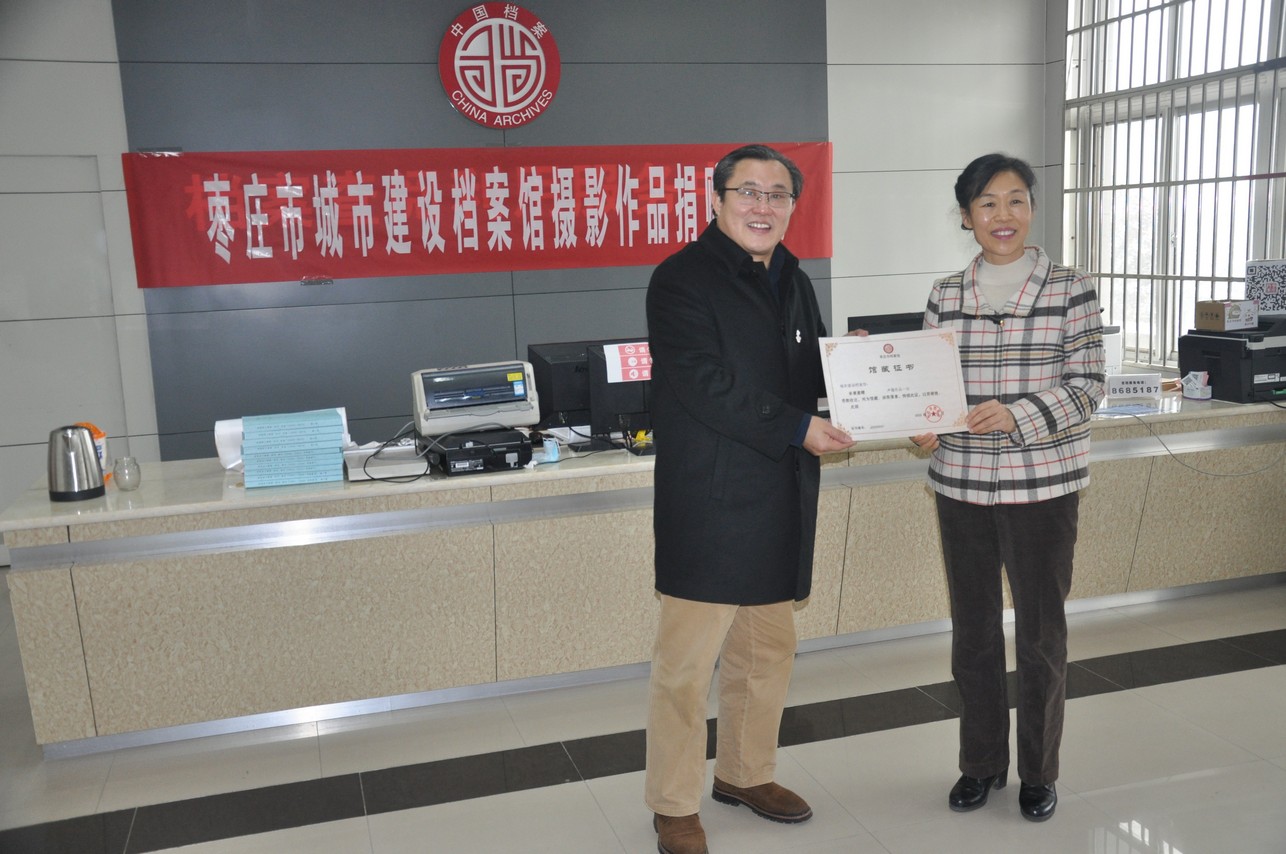 郭丽娜馆长代表市档案馆接受捐赠,并为郑李青馆长颁发馆藏证书,同时聘请城建档案馆声像编研科科长陈良为枣庄市档案馆特聘记者。