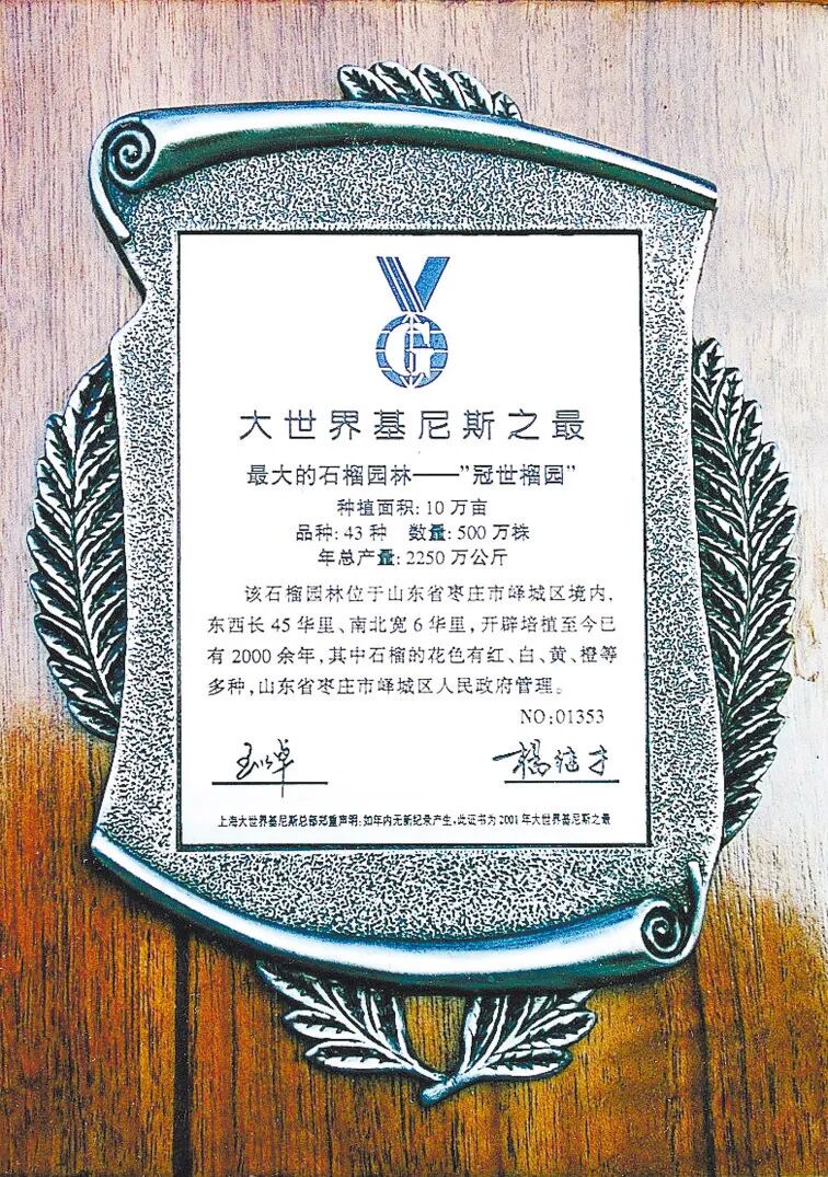 枣庄与石榴的结缘,源自匡衡。《汉书》记载:“匡衡,字稚圭,东海承(今枣庄峄城)人也。”据考证,汉丞相匡衡将石榴从皇家上林苑带出,引入家乡栽培,使得石榴在此扎根并扩散种植。2000多年来,这里已成为世界最大的石榴园林——冠世榴园。其因栽种历史之久、种植面积之大,于2001年被上海大世界基尼斯总部认证为“基尼斯之最”。